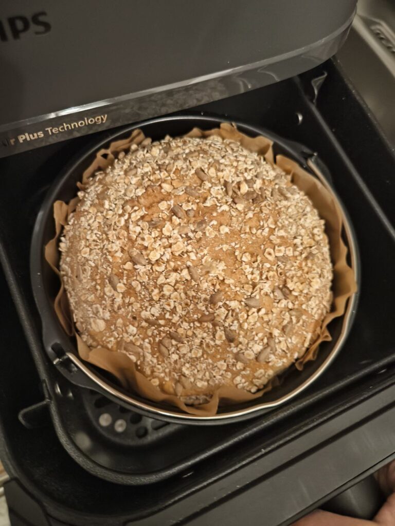 Der Teig geht gleichmäßig auf, bleibt kompakt in der Form und ergibt ein gut gebackenes, alltagstaugliches Airfryer-Brot – ohne Überlaufen oder zu flache Form.